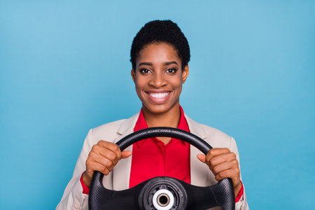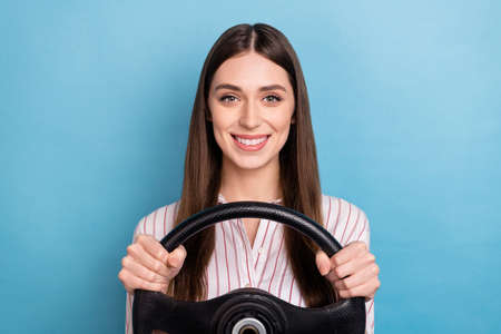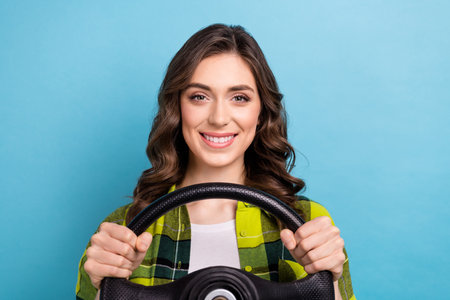 Photo of good mood pretty girl curly hairdo dressed checkered shirt holding steering wheel buy new car isolated on blue color background