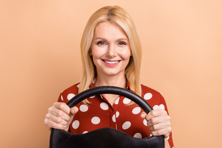 Portrait of charming positive aged person toothy smile hands hold wheel isolated on beige color background