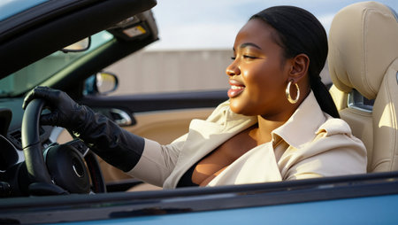 Young african american businesswoman driving convertible car, smiling.
