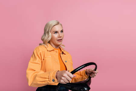 Blonde driver in orange jacket holding steering wheel isolated on pink
