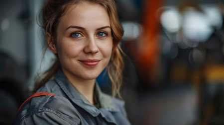 Beautiful young woman in uniform, car mechanic, professional in her field. AI generated.
