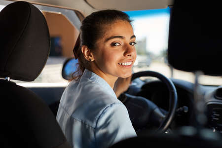 Portrait of a beautiful young woman smiling and looking at camera while sitting in a car