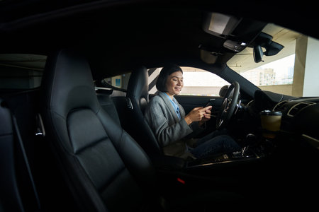 Happy lady driver using her smartphone in car