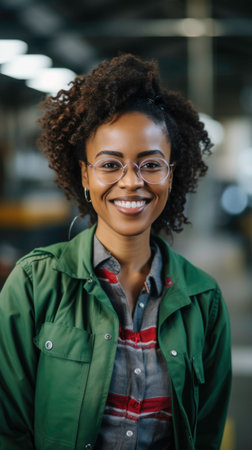 African woman in her 30s, smiling, happy, working in a factory