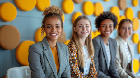 Group of diverse looking business women in a modern office. Businesswomen team in office. Stylish happy office staff. Feminism concept