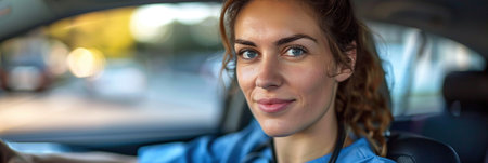 A woman with a confident demeanor sits behind the wheel of a parked car, ready to take on the days journey.