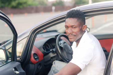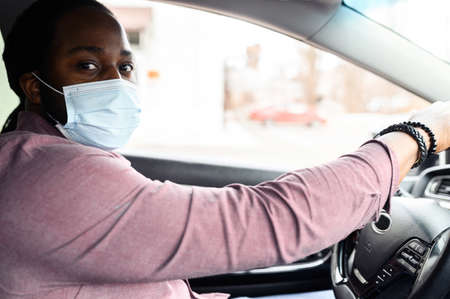 Portrait from inside the car with black african man with medical face mask drives, looking at camera, wants to protect himself from the virus, complies with safety measures, takes care of his health