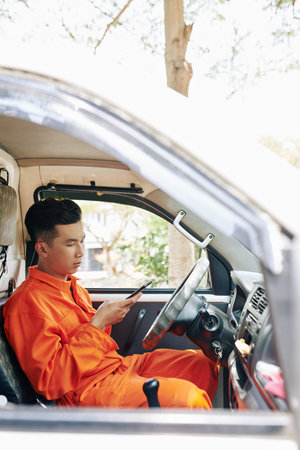 Young Asian man working in house moving service company sitting relaxed in van using his smart phone, vertical shot