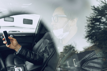 Delivery man employee driving car and using mobile phone during coronavirus pandemic situation