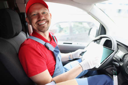 Man courier sitting behind wheel of car and holding digital tablet in his hands