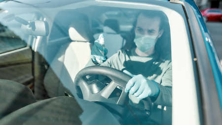 A man driving a car in a protective mask and gloves.Prevention of coronavirus infection.Protective measures against coronavirus, covid-19