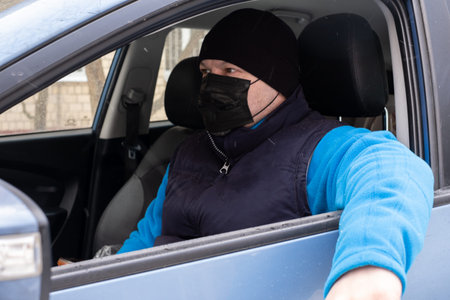 Man driving a car wearing on a medical mask during an epidemic, a driver in a mask, protection from the virus. Transport isolation.