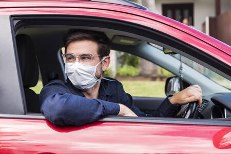 Young man taxi driver looks out of vehicle's window wears sterile medical mask in the car. A boy behind the car steering wheel safely driving keeping social distance. Coronavirus pandemic concept