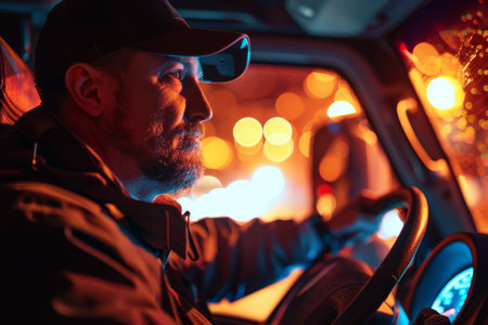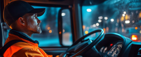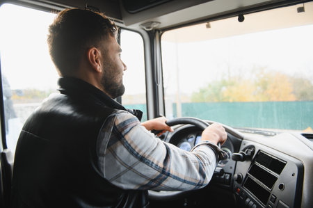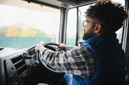Driver transporting goods, focused on the journey, navigating commercial cargo vehicle, performing shipping job