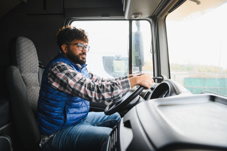 Smiling indian male truck driver operating his heavy vehicle, transporting goods through logistics and delivery