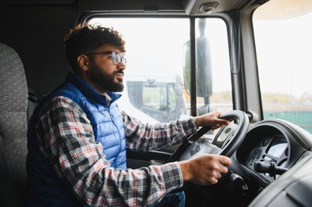 Indian man driving a semi truck, focusing on the road during a journey, representing logistics and transport industry