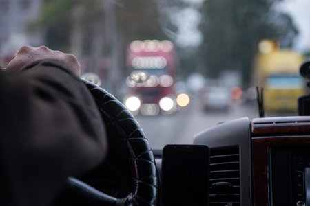 a man's hand firmly holding the steering wheel, embodying control and direction amidst the city's dynamic environment
