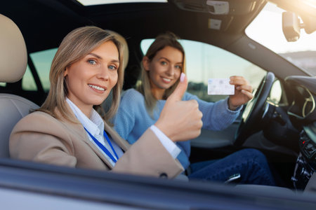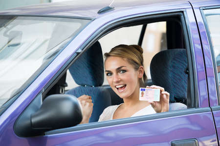 Happy woman holding driver license in car. First time driving car after exam in driving school