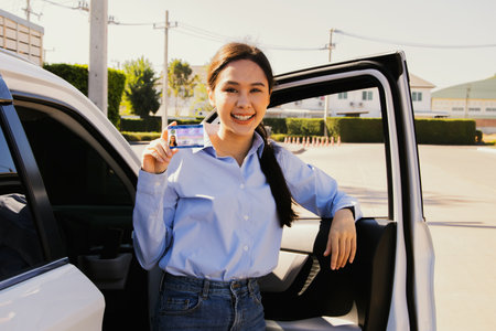 Portrait young asian woman standing smart outside the door of her car showing ownership new personal car license proudly legal happy cheerful ready for a carefree journey