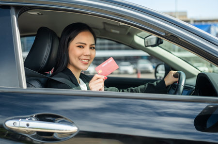 Portrait young asian woman sitting in her car show ownership of personal car license card passed test and pass exam pointing to new card with pride happy cheerful ready to drive car