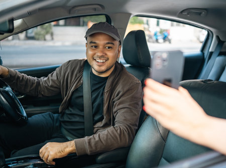 Young asian woman traveler talking with taxi driver explain the route how to travel in direction destination. Passenger showing the direction to taxi driver travel in city. Driver application service