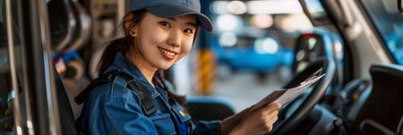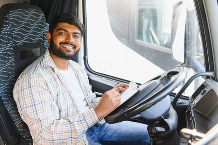 Indian man driver smiling, holding clipboard, writing notes inside cargo truck cab, representing logistics and transport careers