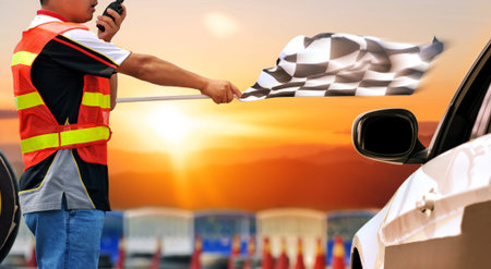 Racer of formula 1 in a racing car. Race and motivation concept. Wonderfull sunset. 3d rendering.