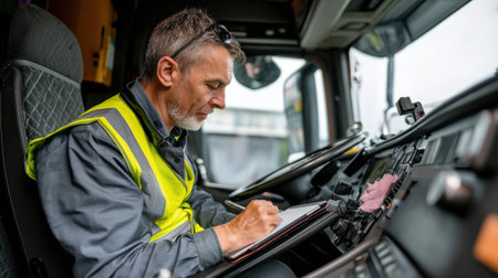 Indian man inside a semi truck cab writing on a clipboard, completing essential paperwork for transport and cargo delivery