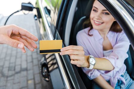 Selective focus of cheerful woman sitting in car and giving credit card to worker at gas station