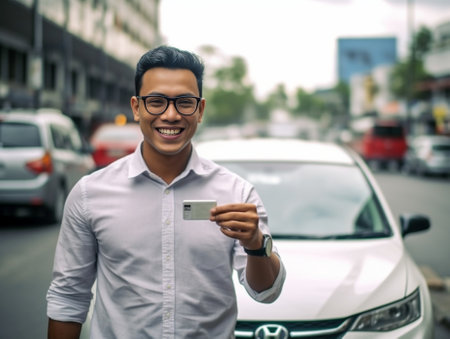Young asian man sitting in the modern car and holding blank of white card. For car rental or car business concept