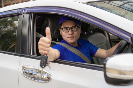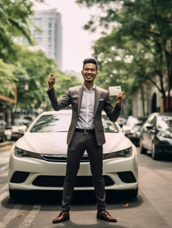 Young handsome asian man getting the new car.He showing car key and very happy. Buy or rent a car concept.