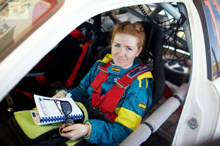 ALMATY, KAZAKHSTAN - APRIL 9: Orlova (11) preparing to start at auto competition Rally Borly April 9, 2011 in Almaty, Kazakhstan.