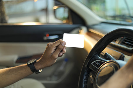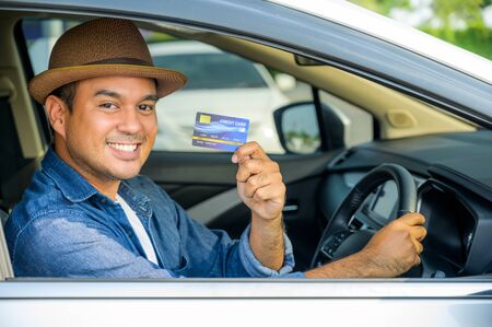 An Asian man is holding a credit card in his hand. While he was driving This picture is about shopping. Spending money Expenses related to car bills by credit card