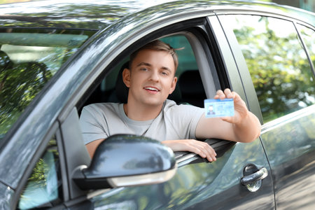 Attractive smiling young man proudly showing his driving license out of car window. Man has got driving license and feels very happy and excited. Ready to drive