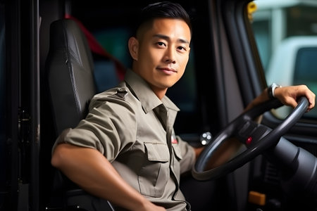 Professional male truck driver Asian driving transport vehicle and fastening seat belt safety. men trucker confident smile and look navigation device. concept Courier man, Transportation, delivery