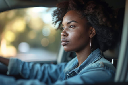 Serene african american woman in denim jacket driving car with thoughtful reflection and focus on safety, journey, and travel, looking forward through the dashboard window in natural light