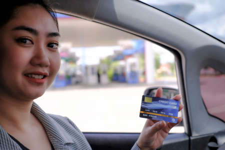 Happy beautiful Asian woman sitting inside her car showing credit card payment at a gas station