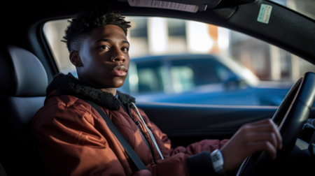 Dark-skinned serious teenager driving a car learns driving in a driving school. High quality photo