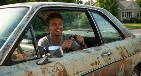 Generative AI : girl in the car smiling showing the keys caucasian people