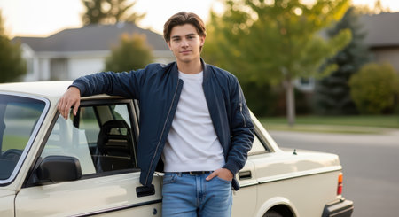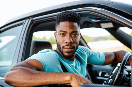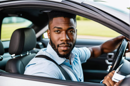 In searching of adventures Happy young man looking at camera and smiling while sitting at the front seat of his minivan : Generative AI