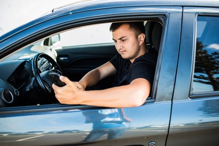 Smiling man using smartphone sitting on driver's seat in car. Car travel, lifestyle concept.