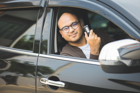 Young asian man driving car. Relaxing, Holiday, Activities, travel, Insurance agent concept.