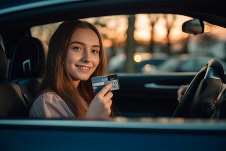 Woman smiles while sitting in car and holding her drivers license. She has just passed her driving school test and feels happy and accomplished.