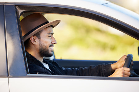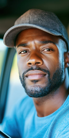Confident Man in Casual Cap Sitting in Car, Close Up Portrait.