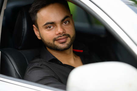 Close-up portrait of a young Indian male taxi driver with a friendly expression, sitting in the driver's seat of a taxi.