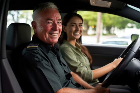 Both the driving instructor and the adult learner smile inside the vehicle. Lessons catered for grown-ups