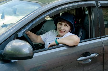 Mature woman sitting in a car driver's seat, smiling warmly with a hand rested on the window. The scene conveys a feeling of contentment and enjoyment, capturing a relaxed moment.