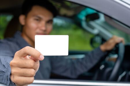 Young asian man sitting in the modern car and holding blank of white card. For car rental or car business concept