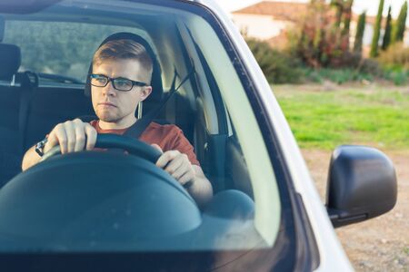 Fresh driver, traveling concept. Young man wearing jeans shirt having long hair driving car carefully on sunny day, front view