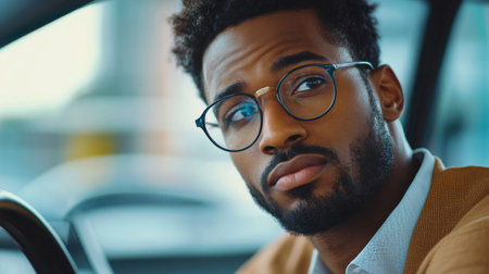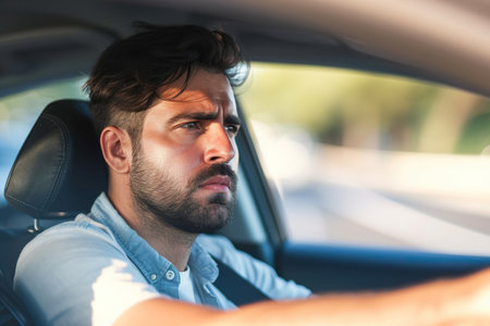 Emotional Latin man driving a car, had an accident. Sad driver stuck in traffic.